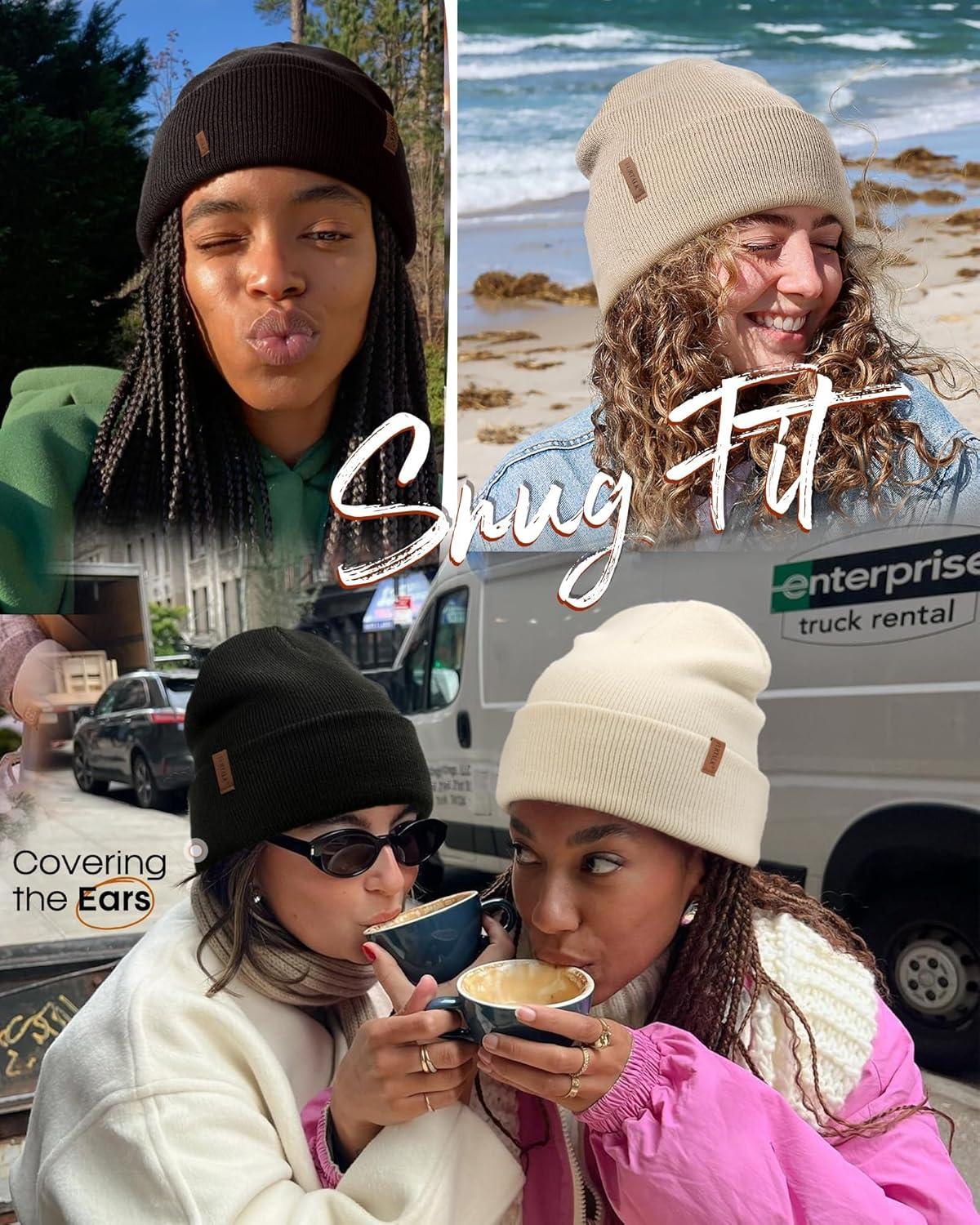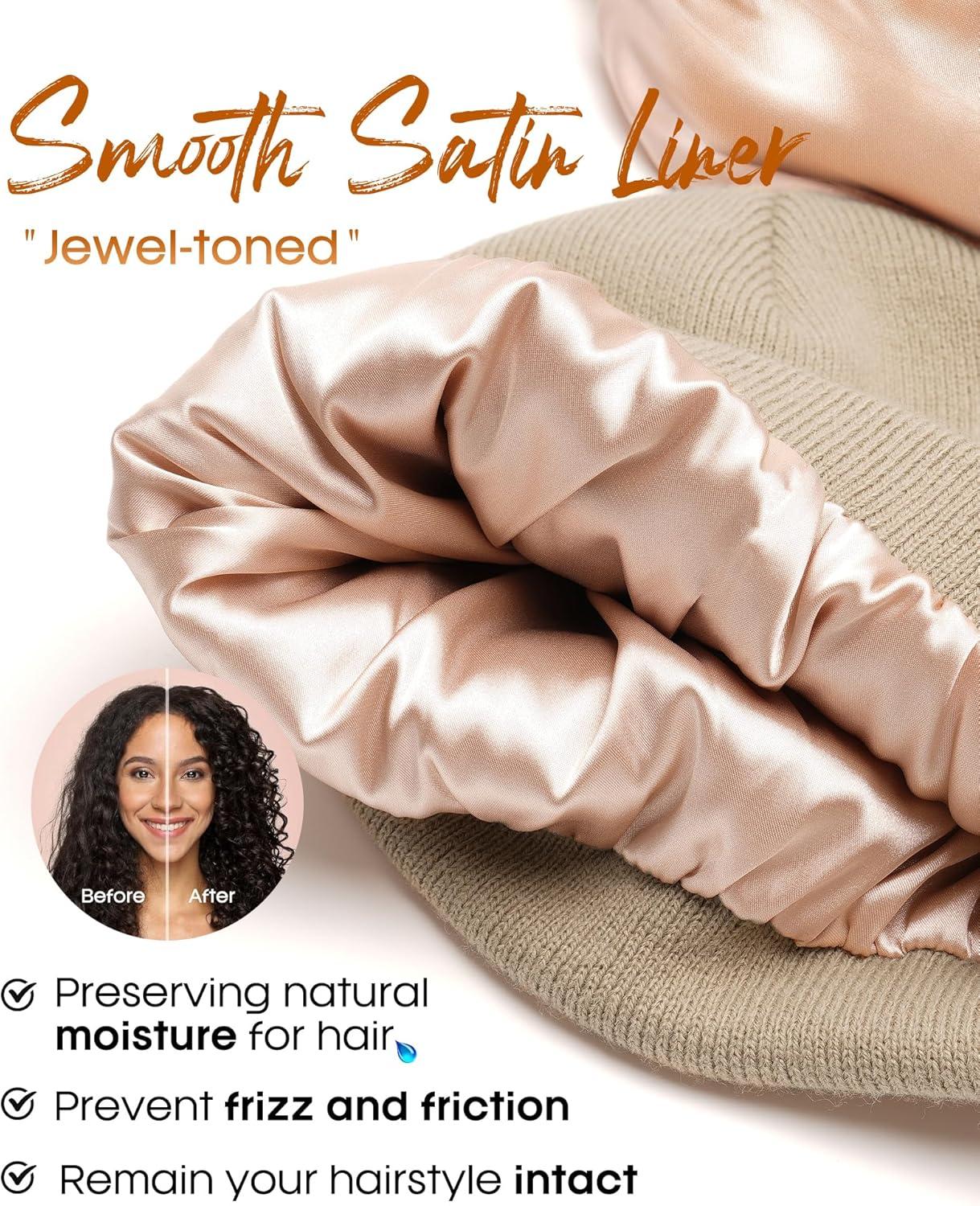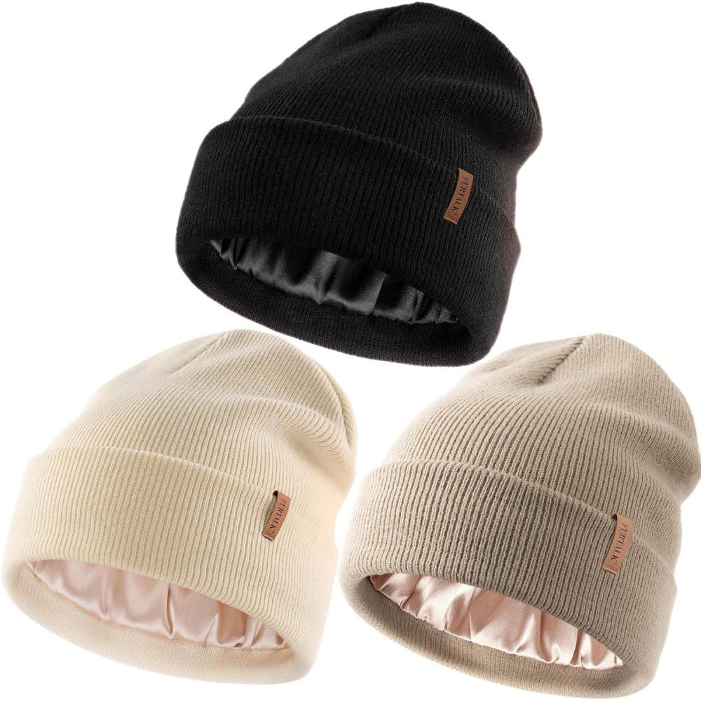 FURTALK Womens Winter Warm Satin Lined Beanie Hats Silk Lining Unisex Knit Slouchy Caps(Black+beige+light Khaki)