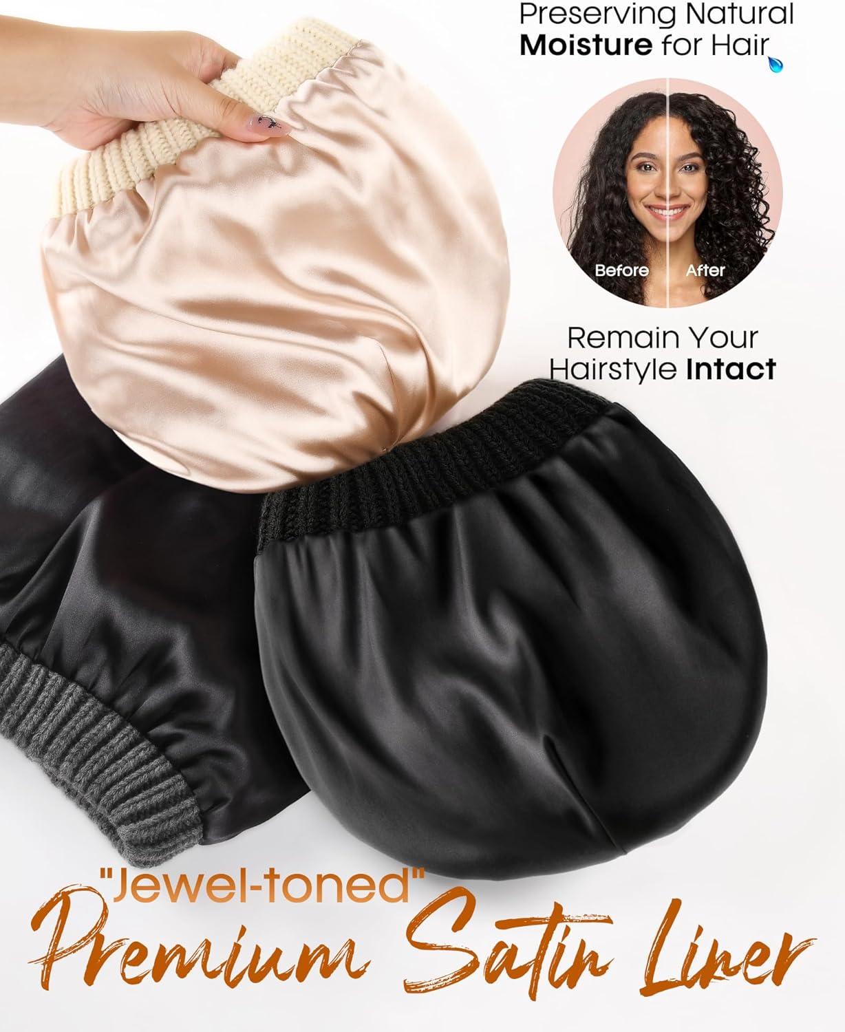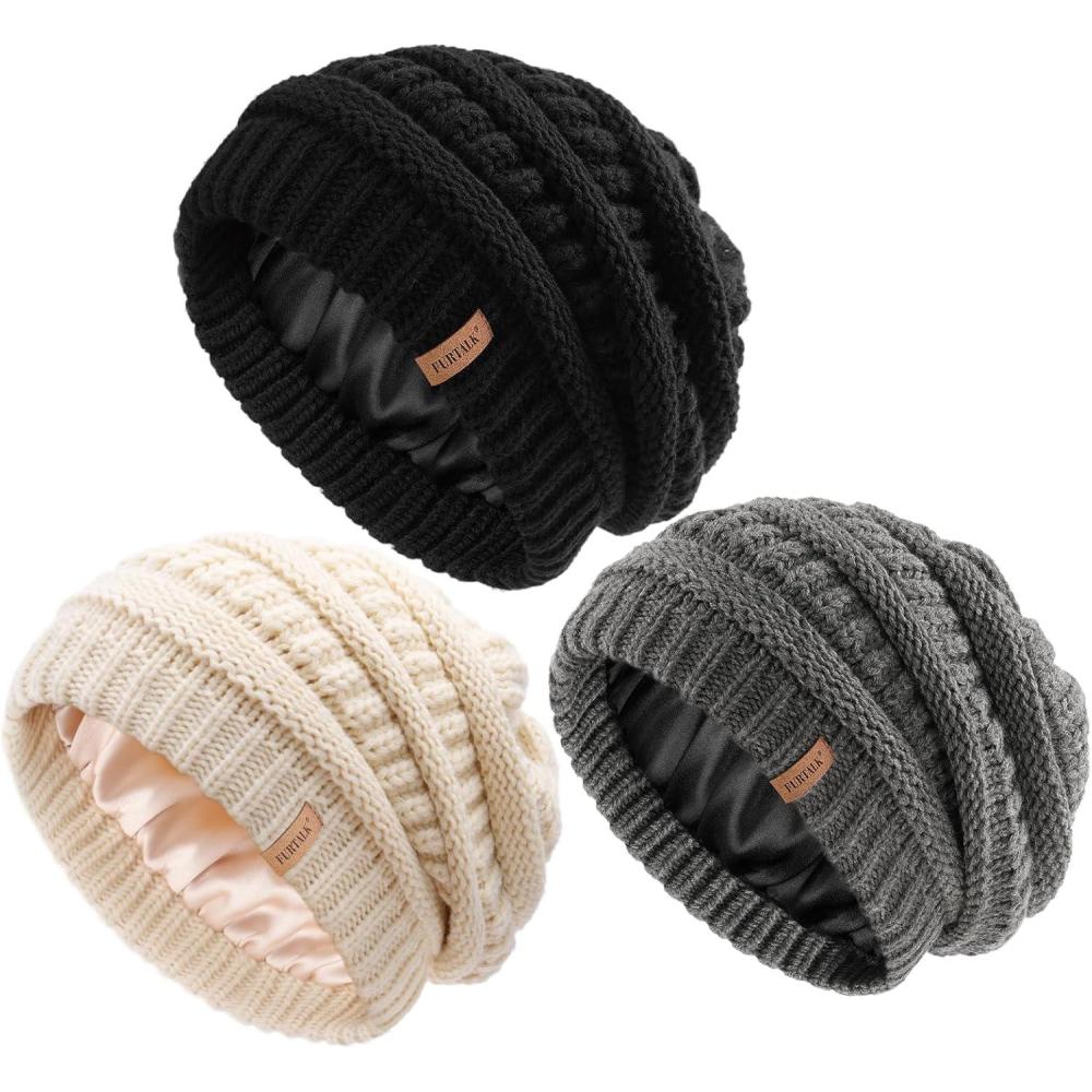 FURTALK Womes Slouchy Winter Beanie Knit Hat Satin Lined 3 Pack Thick Warm Fashionable Skull Cap(Black+dark Grey+beige)