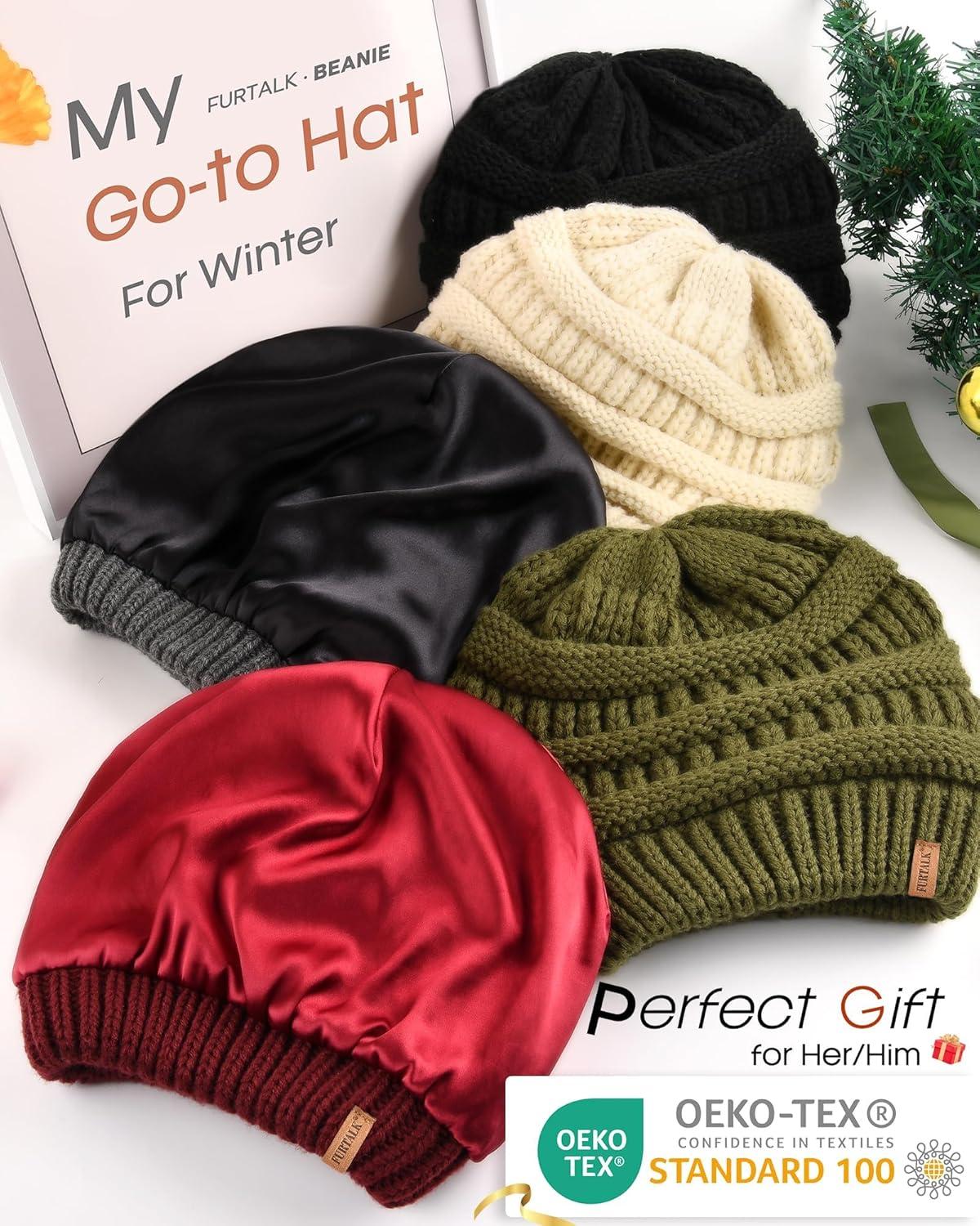FURTALK Womes Slouchy Winter Beanie Knit Hat Satin Lined 3 Pack Thick Warm Fashionable Skull Cap(Black+green+beige)